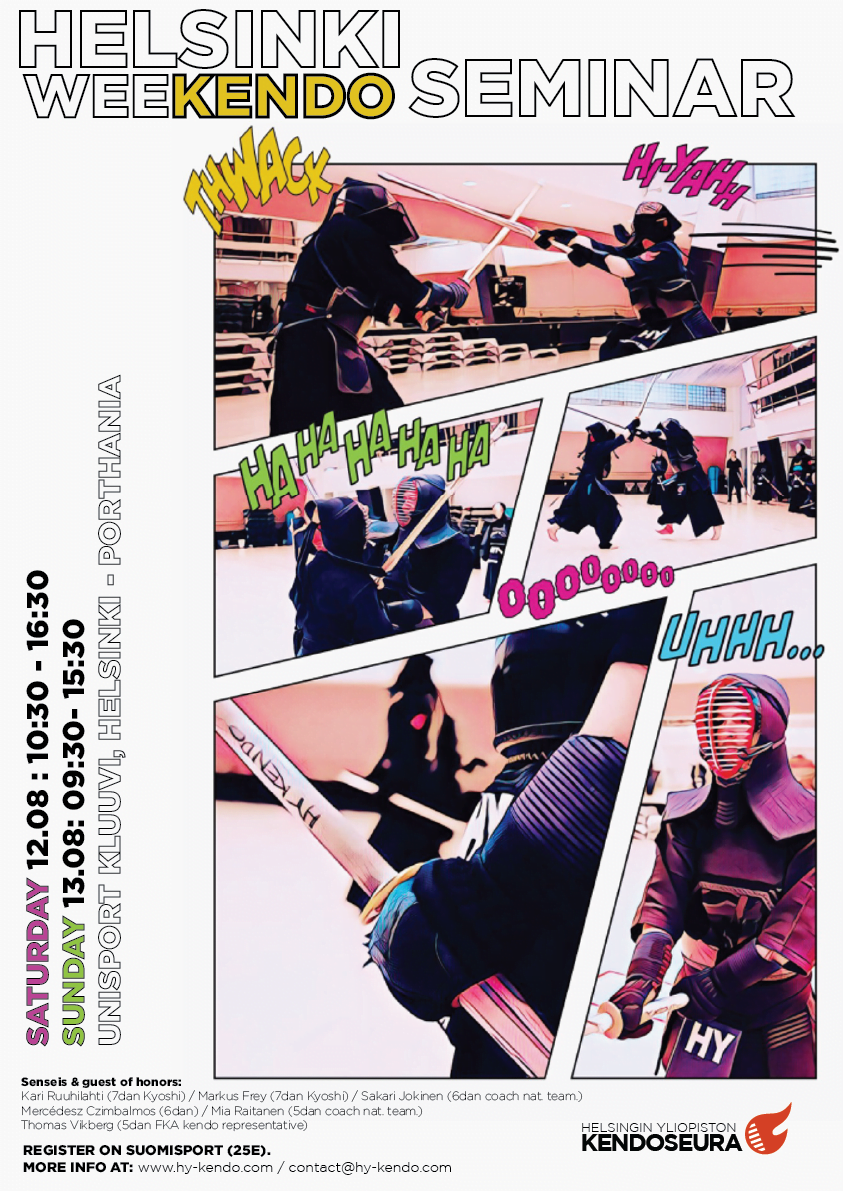 We won’t have anyone from outside taking pictures this year. But if you happen to take some pictures or videos and share them on social media, don’t forget to @hykendo and #weekendo. We are starting our next beginner’s course the 08.09 and will start advertising for university students massively, so anything can help 🙂 Finally, I use this channel to inform you that the shiai event #2 of the Capital Region Kendo league will be hosted by Lebudo and take place in Espoo the Saturday 30th of September, you can already register on Suomisport.
